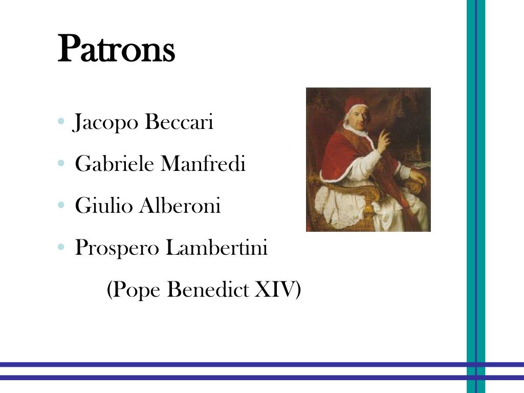 Patrons • Jacopo Beccari • Gabriele Manfredi • Giulio Alberoni • Prospero Lambertini • (Pope Benedict XIV)