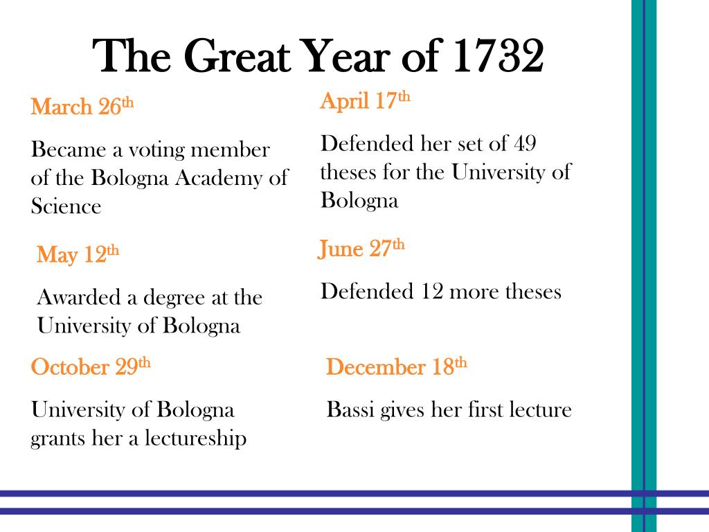 The Great Year of 1732 April 17th Defended her set of 49 theses for the University of Bologna March 26th Became a voting member of the Bologna Academy of Science June 27th Defended 12 more theses May 12th Awarded a degree at the University of Bologna October 29th University of Bologna grants her a lectureship December 18th Bassi gives her first lecture