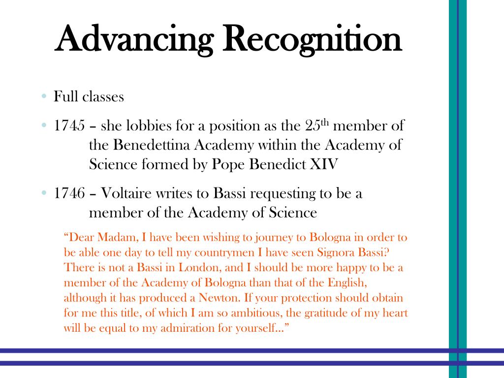 Advancing Recognition • Full classes • 1745 – she lobbies for a position as the 25th member of the Benedettina Academy within the Academy of Science formed by Pope Benedict XIV • 1746 – Voltaire writes to Bassi requesting to be a member of the Academy of Science • “Dear Madam, I have been wishing to journey to Bologna in order to be able one day to tell my countrymen I have seen Signora Bassi? There is not a Bassi in London, and I should be more happy to be a member of the Academy of Bologna than that of the English, although it has produced a Newton. If your protection should obtain for me this title, of which I am so ambitious, the gratitude of my heart will be equal to my admiration for yourself…”