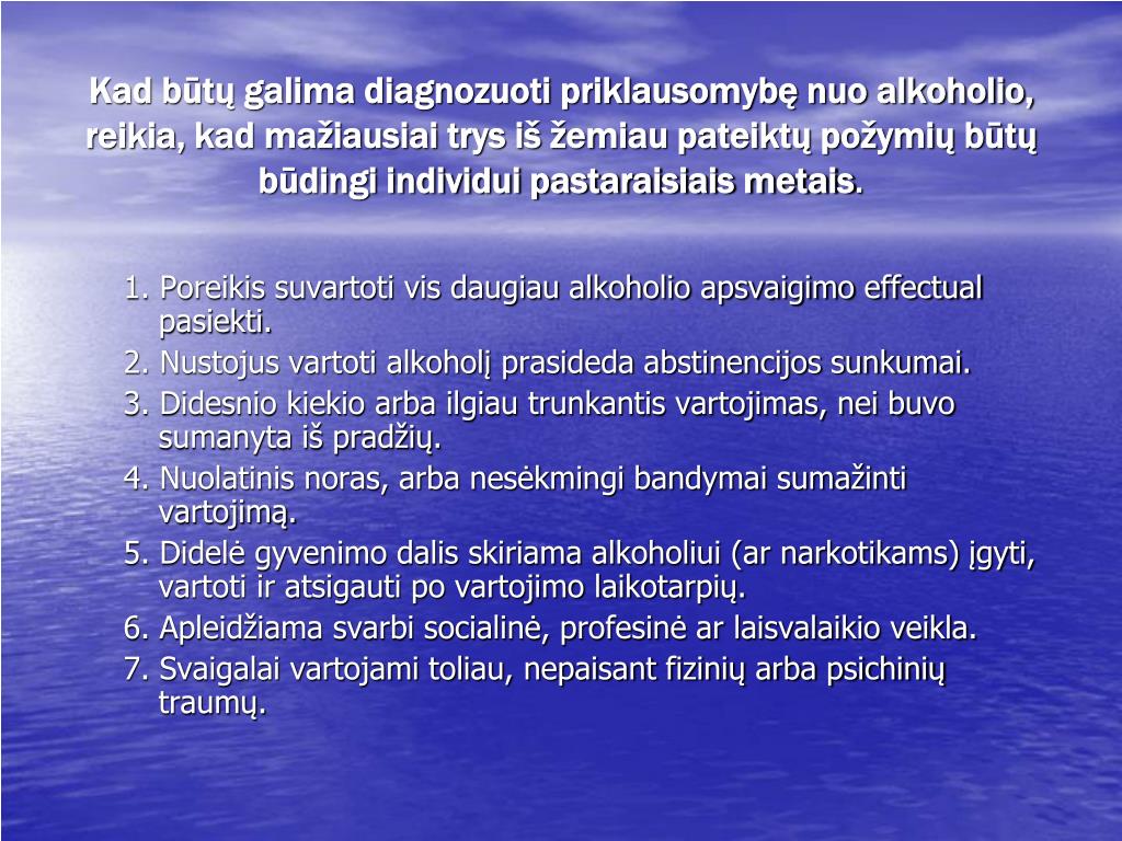 Kad būtų galima diagnozuoti priklausomybę nuo alkoholio, reikia, kad mažiausiai trys iš žemiau pateiktų požymių būtų būdingi individui pastaraisiais metais. 1. Poreikis suvartoti vis daugiau alkoholio apsvaigimo effectual pasiekti. 2. Nustojus vartoti alkoholį prasideda abstinencijos sunkumai. 3. Didesnio kiekio arba ilgiau trunkantis vartojimas, nei buvo sumanyta iš pradžių. 4. Nuolatinis noras, arba nesėkmingi bandymai sumažinti vartojimą. 5. Didelė gyvenimo dalis skiriama alkoholiui (ar narkotikams) įgyti, vartoti ir atsigauti po vartojimo laikotarpių. 6. Apleidžiama svarbi socialinė, profesinė ar laisvalaikio veikla. 7. Svaigalai vartojami toliau, nepaisant fizinių arba psichinių traumų.