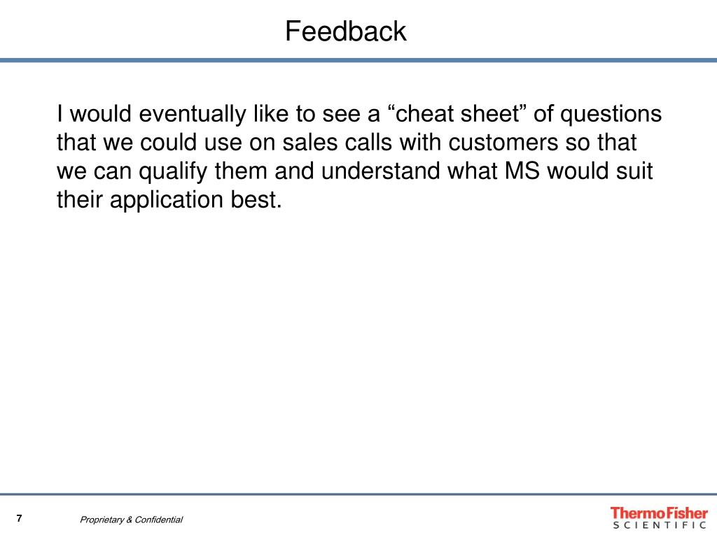 Feedback I would eventually like to see a “cheat sheet” of questions that we could use on sales calls with customers so that we can qualify them and understand what MS would suit their application best.