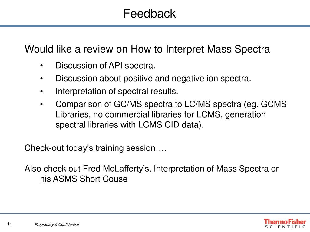 Feedback • Would like a review on How to Interpret Mass Spectra • Discussion of API spectra. • Discussion about positive and negative ion spectra. • Interpretation of spectral results. • Comparison of GC/MS spectra to LC/MS spectra (eg. GCMS Libraries, no commercial libraries for LCMS, generation spectral libraries with LCMS CID data). • Check-out today’s training session…. • Also check out Fred McLafferty’s, Interpretation of Mass Spectra or his ASMS Short Couse