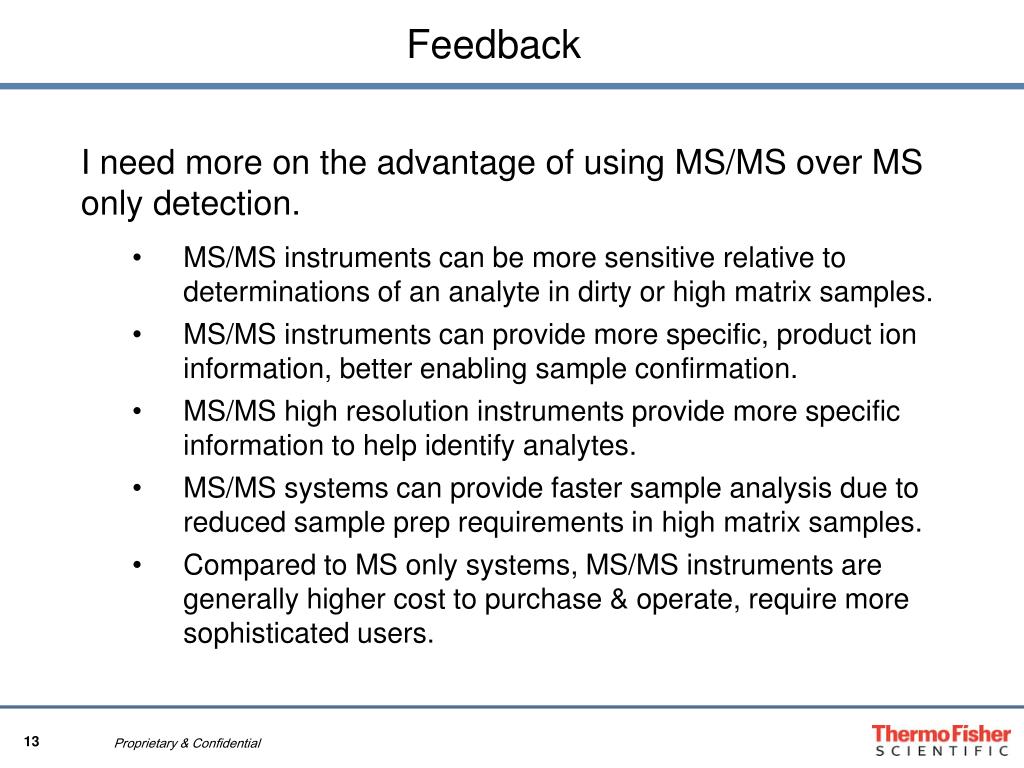 Feedback • I need more on the advantage of using MS/MS over MS only detection. • MS/MS instruments can be more sensitive relative to determinations of an analyte in dirty or high matrix samples. • MS/MS instruments can provide more specific, product ion information, better enabling sample confirmation. • MS/MS high resolution instruments provide more specific information to help identify analytes. • MS/MS systems can provide faster sample analysis due to reduced sample prep requirements in high matrix samples. • Compared to MS only systems, MS/MS instruments are generally higher cost to purchase & operate, require more sophisticated users.