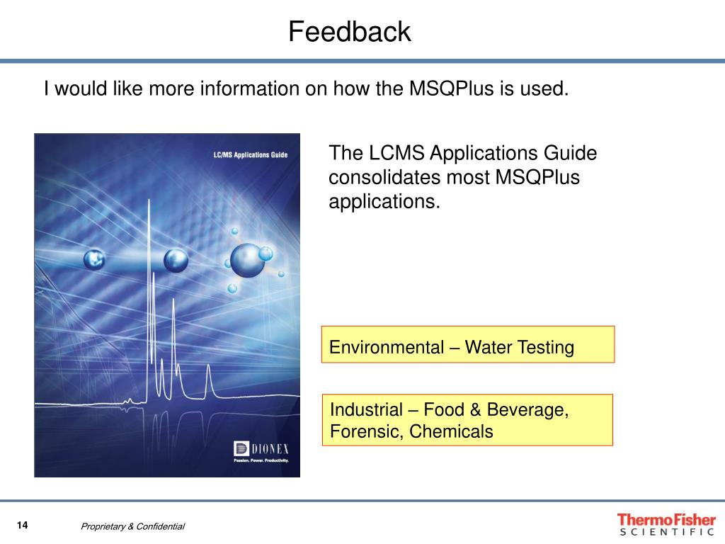 Feedback I would like more information on how the MSQPlus is used. The LCMS Applications Guide consolidates most MSQPlus applications. Environmental – Water Testing Industrial – Food & Beverage, Forensic, Chemicals