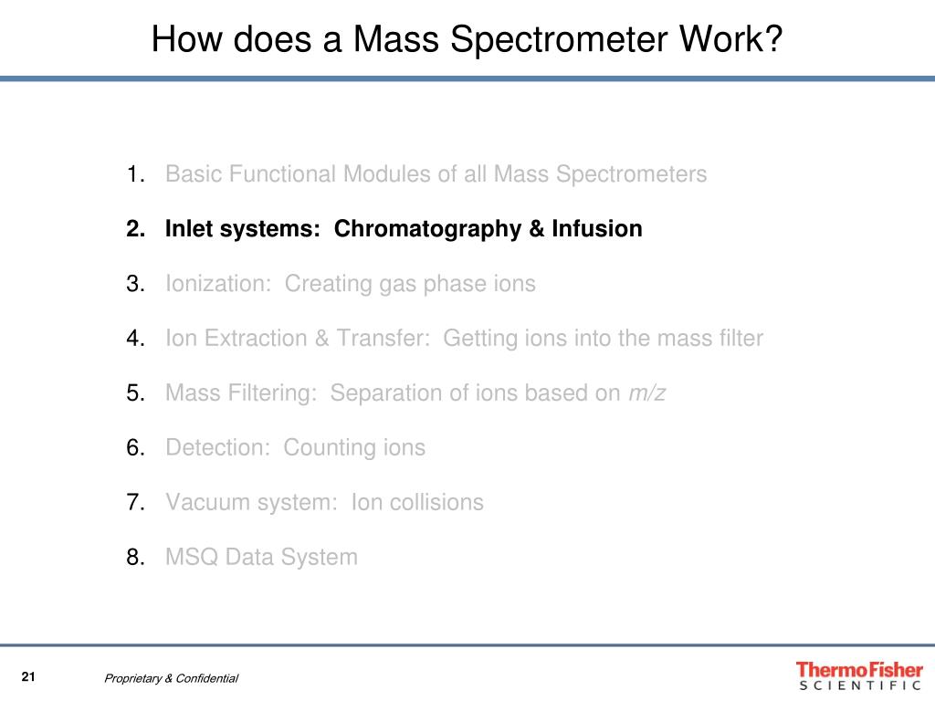 How does a Mass Spectrometer Work? • Basic Functional Modules of all Mass Spectrometers – Overview. • Inlet systems: Chromatography & Infusion • Ionization: Creating gas phase ions • Ion Extraction & Transfer: Getting ions into the mass filter • Mass Filtering: Separation of ions based on m/z • Detection: Counting ions • Vacuum system: Ion collisions • MSQ Data System