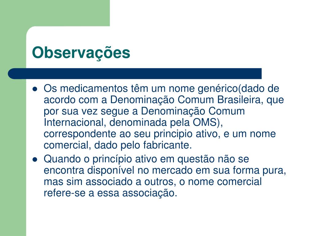 Observações • Os medicamentos têm um nome genérico(dado de acordo com a Denominação Comum Brasileira, que por sua vez segue a Denominação Comum Internacional, denominada pela OMS), correspondente ao seu principio ativo, e um nome comercial, dado pelo fabricante. • Quando o princípio ativo em questão não se encontra disponível no mercado em sua forma pura, mas sim associado a outros, o nome comercial refere-se a essa associação.