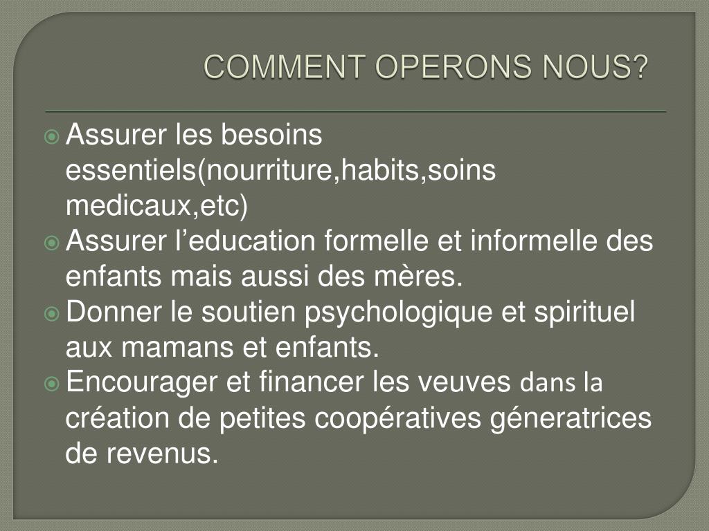 COMMENT OPERONS NOUS? • Assurer les besoinsessentiels(nourriture,habits,soinsmedicaux,etc) • Assurer l’educationformelle et informelle des enfantsmaisaussi des mères. • Donner le soutienpsychologique et spirituel aux mamans et enfants. • Encourager et financer les veuvesdans la création de petites coopérativesgéneratrices de revenus.