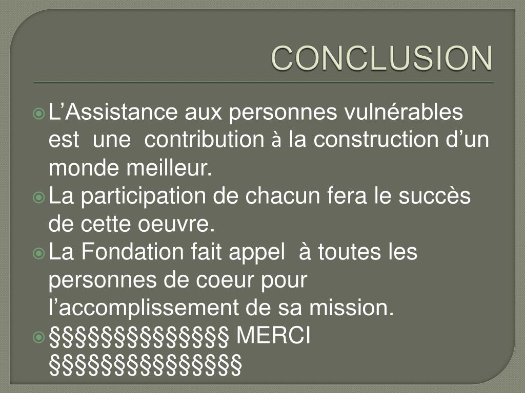 CONCLUSION L’Assistance aux personnes vulnérables est une contribution à la construction d’un monde meilleur. La participation de chacun fera le succès de cette oeuvre. La Fondation fait appel à toutes les personnes de coeur pour l’accomplissement de sa mission. §§§§§§§§§§§§§§ MERCI §§§§§§§§§§§§§§§