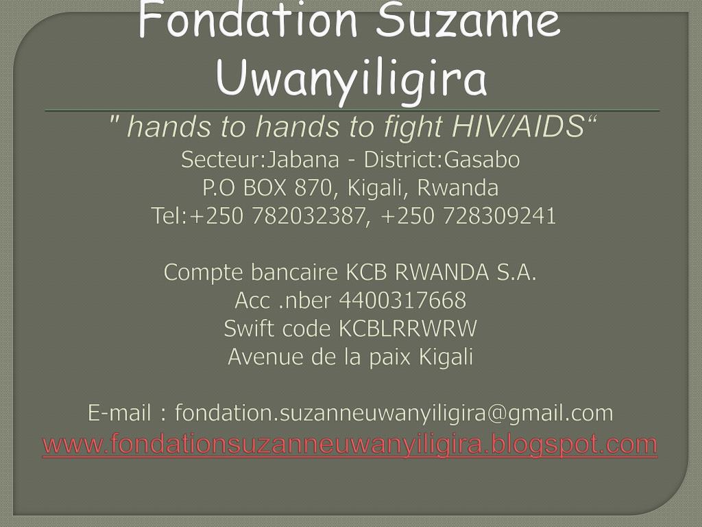Fondation Suzanne Uwanyiligira" hands to hands to fight HIV/AIDS“Secteur:Jabana - District:GasaboP.O BOX 870, Kigali, Rwanda Tel:+250 782032387, +250 728309241Compte bancaire KCB RWANDA S.A.Acc .nber 4400317668Swift code KCBLRRWRWAvenue de la paix KigaliE-mail : fondation.suzanneuwanyiligira@gmail.comwww.fondationsuzanneuwanyiligira.blogspot.com