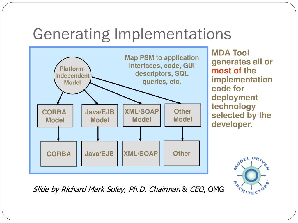 OtherModel XML/SOAPModel Java/EJBModel CORBA Model Other XML/SOAP Java/EJB CORBA Generating Implementations MDA Tool generates all or most of the implementation code for deployment technology selected by the developer. Map PSM to application interfaces, code, GUI descriptors, SQL queries, etc. Platform-Independent Model Slide by Richard Mark Soley, Ph.D. Chairman & CEO, OMG