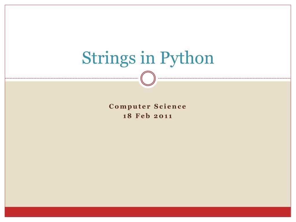 Strings in Python. Computer Science 18 Feb 2011. Introduction. Prior experience Defining string variables Getting user input Printing strings Lesson Objectives Understand string structure Access characters and sub-sections from a string Concatenate strings Traverse a string.
