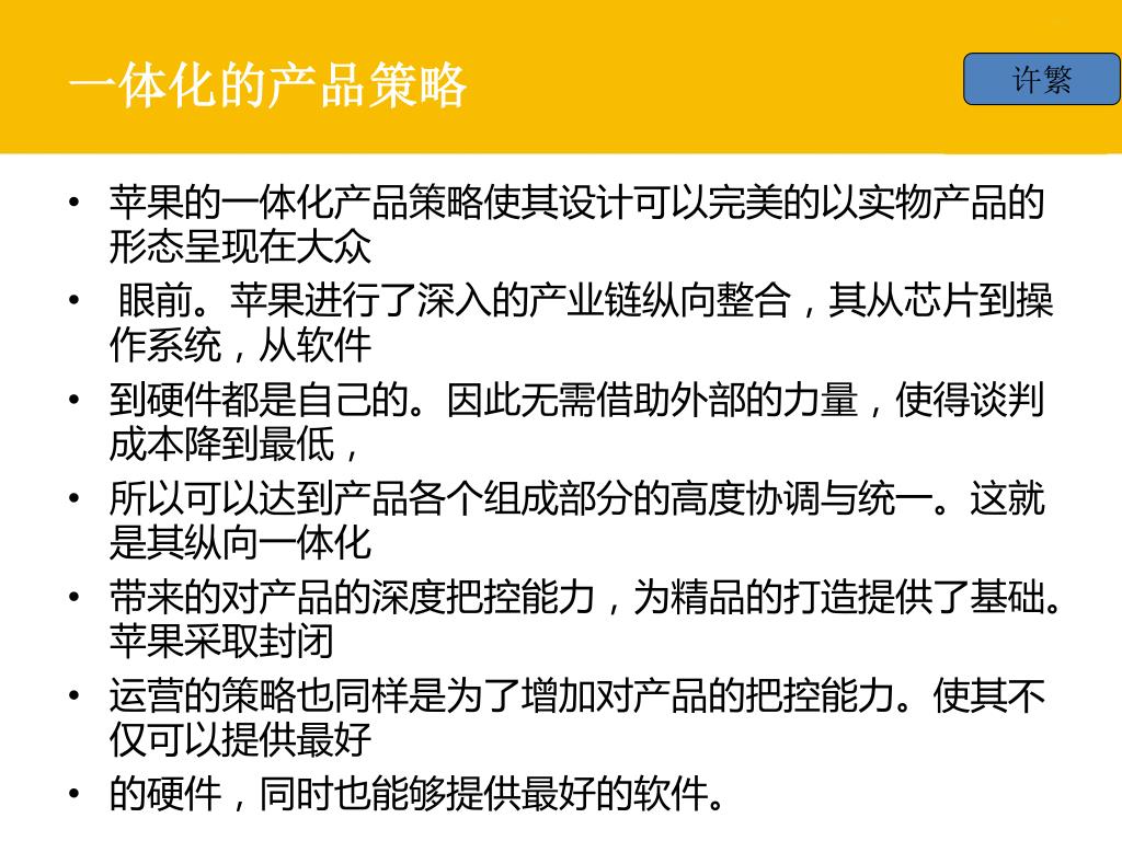 一体化的产品策略 许繁 • 苹果的一体化产品策略使其设计可以完美的以实物产品的形态呈现在大众 • 眼前。苹果进行了深入的产业链纵向整合,其从芯片到操作系统,从软件 • 到硬件都是自己的。因此无需借助外部的力量,使得谈判成本降到最低, • 所以可以达到产品各个组成部分的高度协调与统一。这就是其纵向一体化 • 带来的对产品的深度把控能力,为精品的打造提供了基础。苹果采取封闭 • 运营的策略也同样是为了增加对产品的把控能力。使其不仅可以提供最好 • 的硬件,同时也能够提供最好的软件。