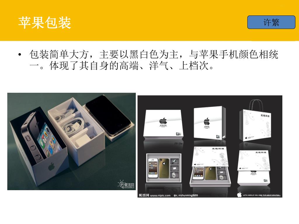 苹果包装 许繁 • 包装简单大方,主要以黑白色为主,与苹果手机颜色相统一。体现了其自身的高端、洋气、上档次。