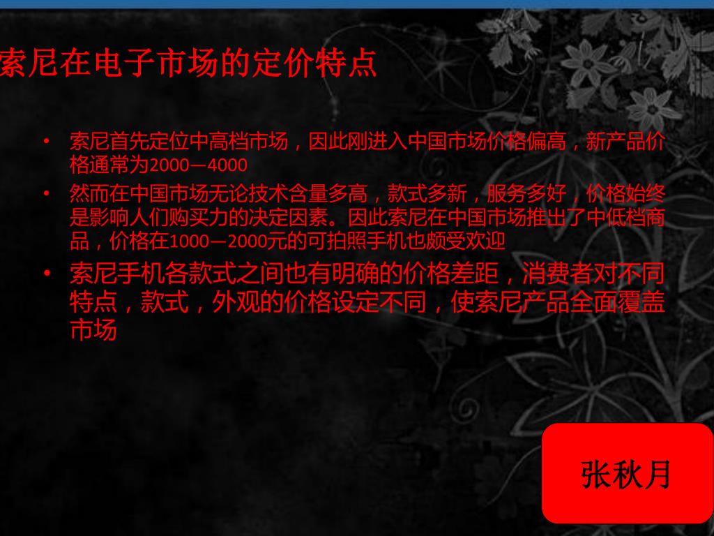 索尼商品的定价特点 张秋月 1索尼会较小单位报价法 2索尼会出示各种证据证明价格是合理的 3索尼会在小事上慷慨 例如:耳机,手机套,贴膜等小商品上让价 4索尼会用比较法说明价格的合理性