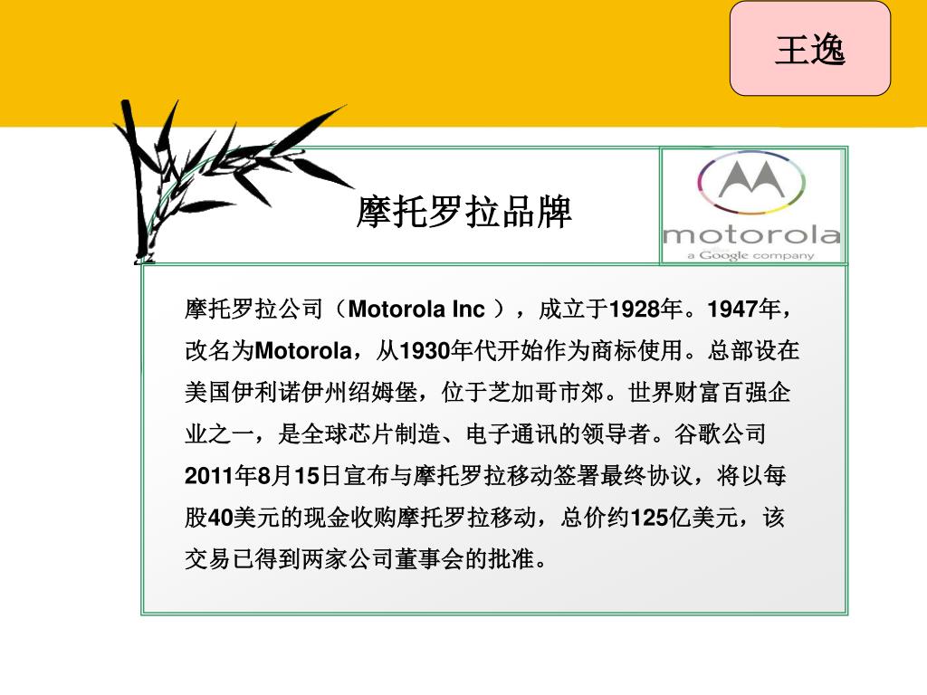 Text • Text • Text 王逸 摩托罗拉品牌 摩托罗拉公司(Motorola Inc ),成立于1928年。1947年,改名为Motorola,从1930年代开始作为商标使用。总部设在美国伊利诺伊州绍姆堡,位于芝加哥市郊。世界财富百强企业之一,是全球芯片制造、电子通讯的领导者。谷歌公司2011年8月15日宣布与摩托罗拉移动签署最终协议,将以每股40美元的现金收购摩托罗拉移动,总价约125亿美元,该交易已得到两家公司董事会的批准。