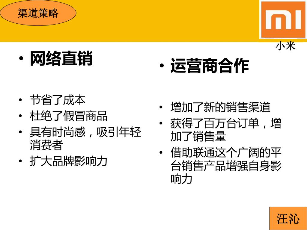 网络直销 节省了成本 杜绝了假冒商品 具有时尚感,吸引年轻消费者 扩大品牌影响力 运营商合作 增加了新的销售渠道 获得了百万台订单,增加了销售量 借助联通这个广阔的平台销售产品增强自身影响力 渠道策略 小米 汪沁