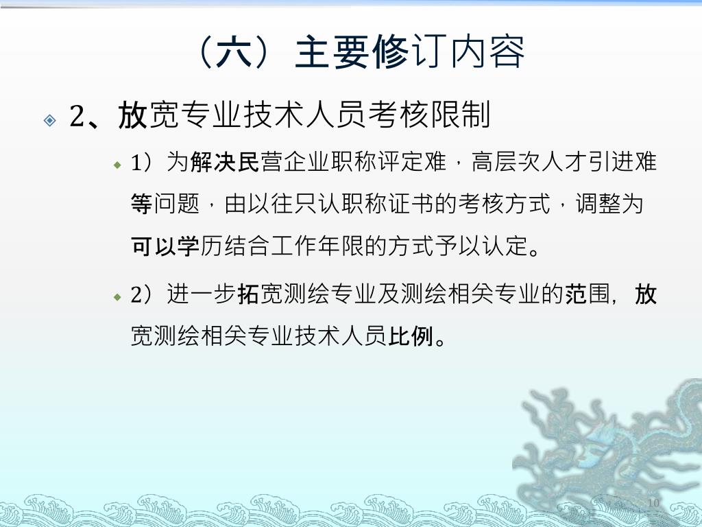 (六)主要修订内容 • 2、放宽专业技术人员考核限制 • 1)为解决民营企业职称评定难,高层次人才引进难等问题,由以往只认职称证书的考核方式,调整为可以学历结合工作年限的方式予以认定。 • 2)进一步拓宽测绘专业及测绘相关专业的范围,放宽测绘相关专业技术人员比例。