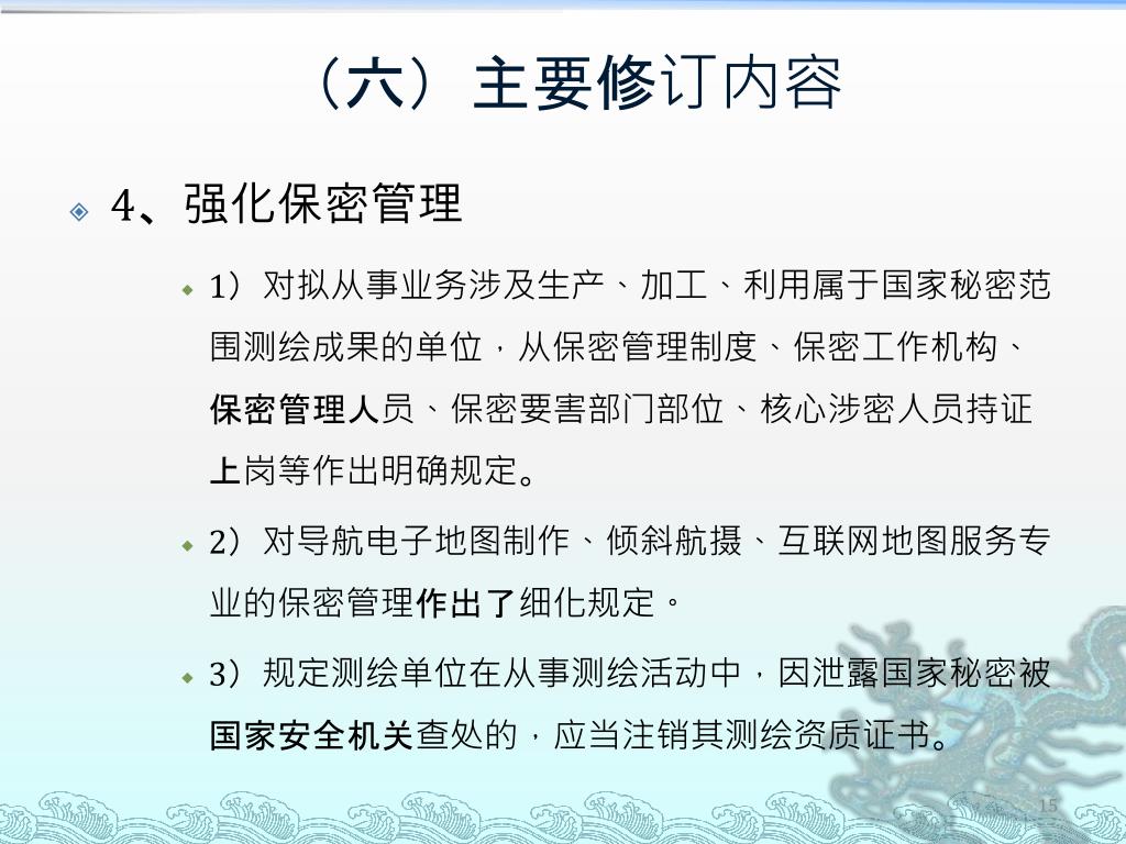 (六)主要修订内容 • 4、强化保密管理 • 1)对拟从事业务涉及生产、加工、利用属于国家秘密范围测绘成果的单位,从保密管理制度、保密工作机构、保密管理人员、保密要害部门部位、核心涉密人员持证上岗等作出明确规定。 • 2)对导航电子地图制作、倾斜航摄、互联网地图服务专业的保密管理作出了细化规定。 • 3)规定测绘单位在从事测绘活动中,因泄露国家秘密被国家安全机关查处的,应当注销其测绘资质证书。
