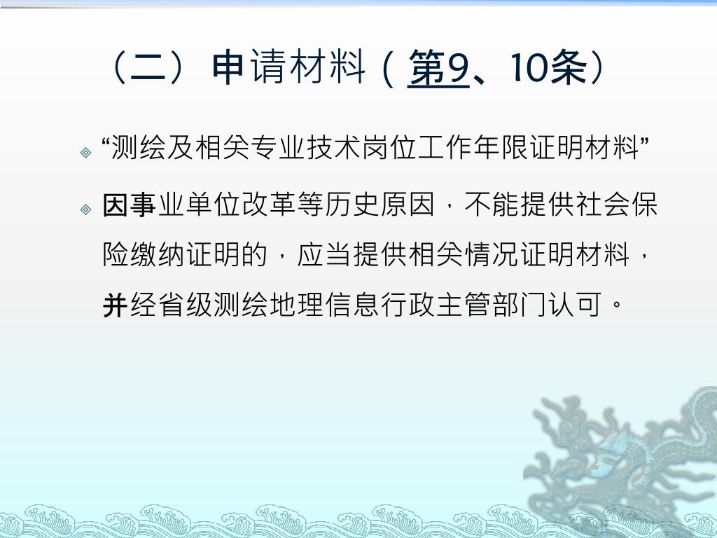 (二)申请材料(第9、10条) • “测绘及相关专业技术岗位工作年限证明材料” • 因事业单位改革等历史原因,不能提供社会保险缴纳证明的,应当提供相关情况证明材料,并经省级测绘地理信息行政主管部门认可。
