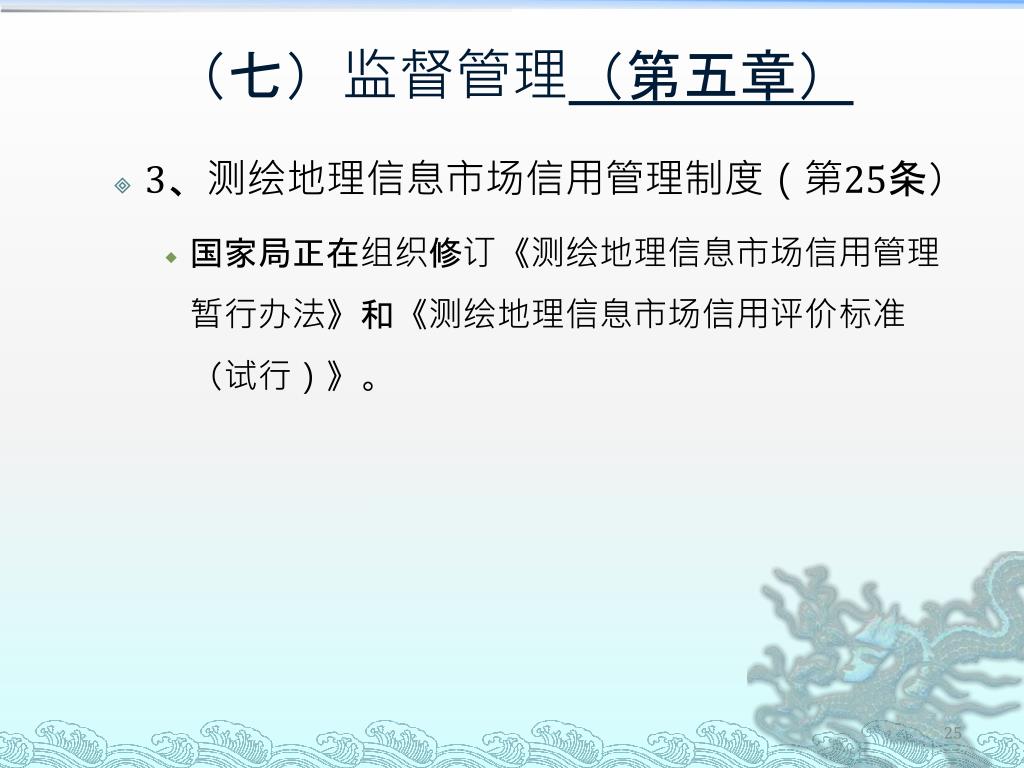(七)监督管理(第五章) • 3、测绘地理信息市场信用管理制度(第25条) • 国家局正在组织修订《测绘地理信息市场信用管理暂行办法》和《测绘地理信息市场信用评价标准(试行)》。