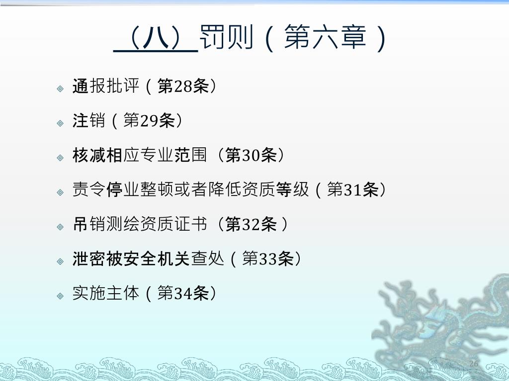 (八)罚则(第六章) • 通报批评(第28条) • 注销(第29条) • 核减相应专业范围(第30条) • 责令停业整顿或者降低资质等级(第31条) • 吊销测绘资质证书(第32条 ) • 泄密被安全机关查处(第33条) • 实施主体(第34条)