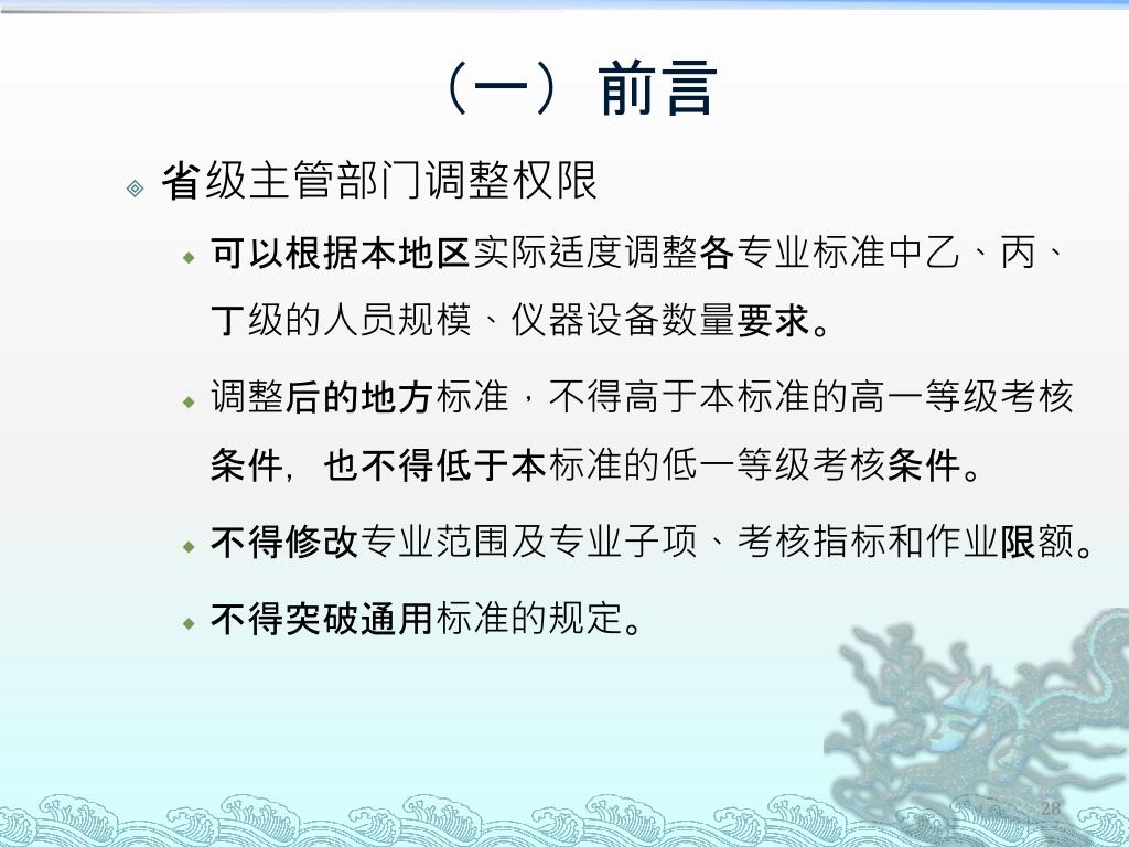 (一)前言 • 省级主管部门调整权限 • 可以根据本地区实际适度调整各专业标准中乙、丙、丁级的人员规模、仪器设备数量要求。 • 调整后的地方标准,不得高于本标准的高一等级考核条件,也不得低于本标准的低一等级考核条件。 • 不得修改专业范围及专业子项、考核指标和作业限额。 • 不得突破通用标准的规定。
