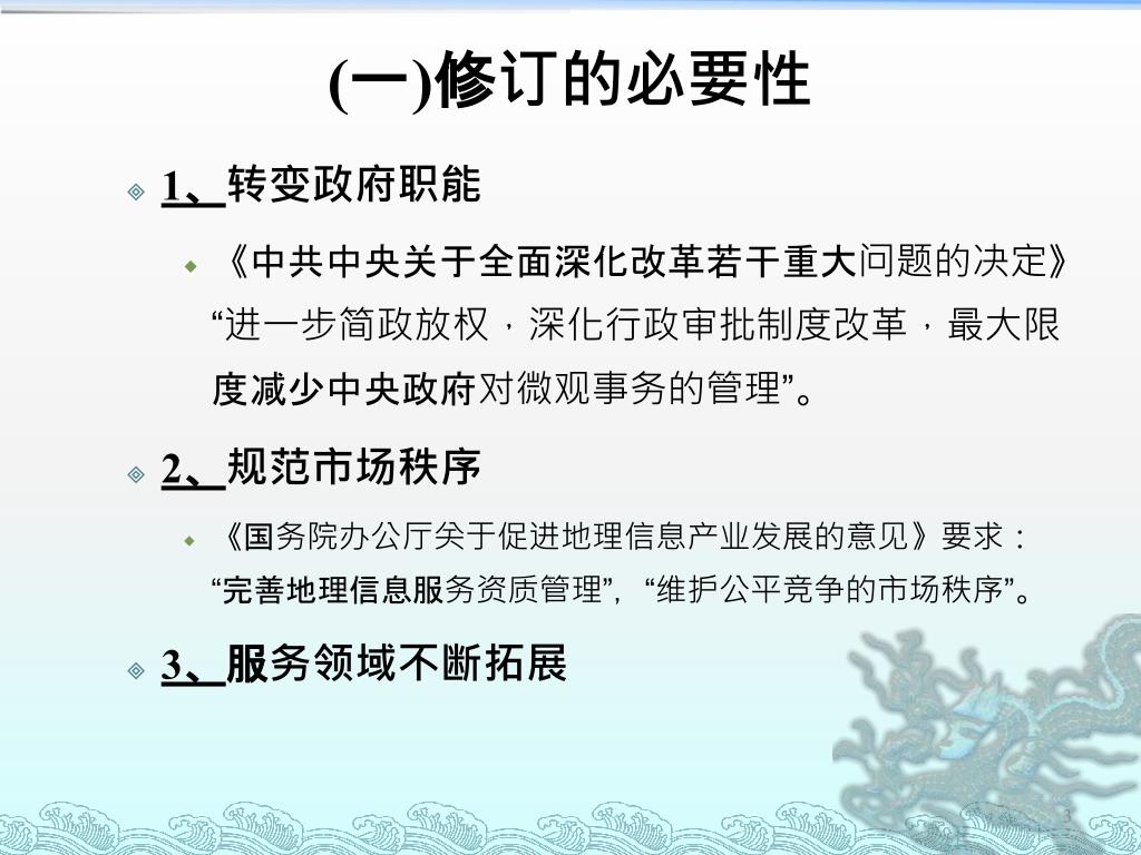 (一)修订的必要性 • 1、转变政府职能 • 《中共中央关于全面深化改革若干重大问题的决定》“进一步简政放权,深化行政审批制度改革,最大限度减少中央政府对微观事务的管理”。 • 2、规范市场秩序 • 《国务院办公厅关于促进地理信息产业发展的意见》要求:“完善地理信息服务资质管理”,“维护公平竞争的市场秩序”。 • 3、服务领域不断拓展