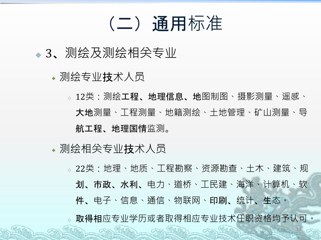 (二)通用标准 • 3、测绘及测绘相关专业 • 测绘专业技术人员 • 12类:测绘工程、地理信息、地图制图、摄影测量、遥感、大地测量、工程测量、地籍测绘、土地管理、矿山测量、导航工程、地理国情监测。 • 测绘相关专业技术人员 • 22类:地理、地质、工程勘察、资源勘查、土木、建筑、规划、市政、水利、电力、道桥、工民建、海洋、计算机、软件、电子、信息、通信、物联网、印刷、统计、生态。 • 取得相应专业学历或者取得相应专业技术任职资格均予认可。