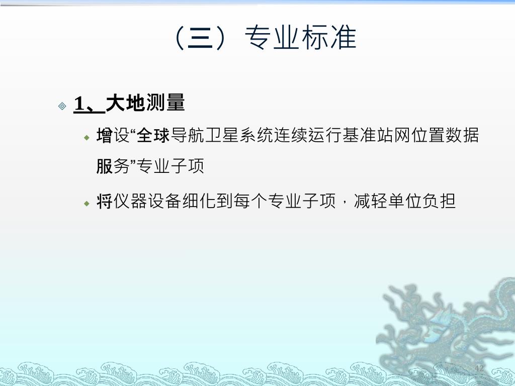 (三)专业标准 • 1、大地测量 • 增设“全球导航卫星系统连续运行基准站网位置数据服务”专业子项 • 将仪器设备细化到每个专业子项,减轻单位负担