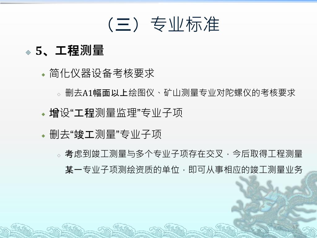 (三)专业标准 • 5、工程测量 • 简化仪器设备考核要求 • 删去A1幅面以上绘图仪、矿山测量专业对陀螺仪的考核要求 • 增设“工程测量监理”专业子项 • 删去“竣工测量”专业子项 • 考虑到竣工测量与多个专业子项存在交叉,今后取得工程测量某一专业子项测绘资质的单位,即可从事相应的竣工测量业务