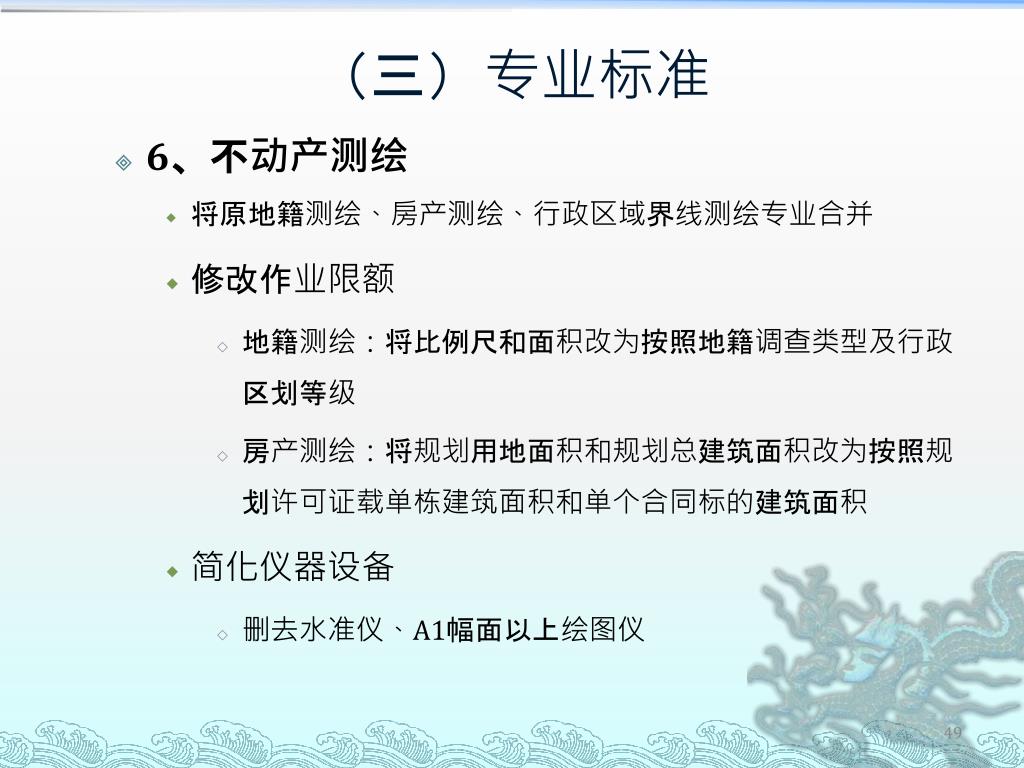 (三)专业标准 • 6、不动产测绘 • 将原地籍测绘、房产测绘、行政区域界线测绘专业合并 • 修改作业限额 • 地籍测绘:将比例尺和面积改为按照地籍调查类型及行政区划等级 • 房产测绘:将规划用地面积和规划总建筑面积改为按照规划许可证载单栋建筑面积和单个合同标的建筑面积 • 简化仪器设备 • 删去水准仪、A1幅面以上绘图仪