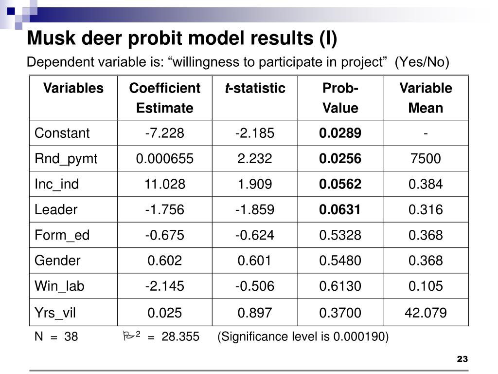 Musk deer probit model results (II)Dependent variable is: “willingness to participate in project” (Yes/No)