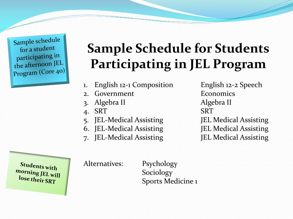 Sample schedule for a student participating in the afternoon JEL Program (Core 40) Sample Schedule for Students Participating in JEL Program English 12-1 Composition English 12-2 Speech Government Economics Algebra II Algebra II SRT SRT JEL-Medical Assisting JEL Medical Assisting JEL-Medical Assisting JEL Medical Assisting JEL-Medical Assisting JEL Medical Assisting Alternatives: Psychology Sociology Sports Medicine 1 Students with morning JEL will lose their SRT
