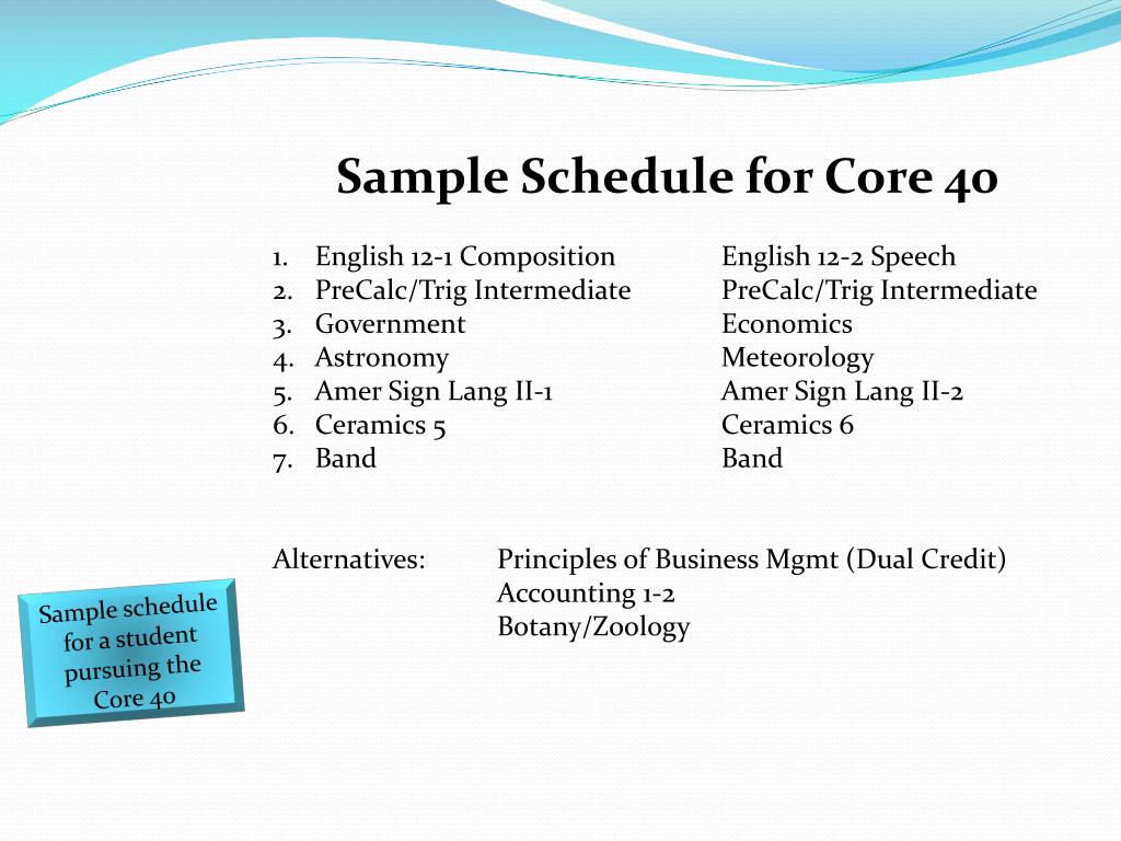 Sample Schedule for Core 40 English 12-1 Composition English 12-2 Speech PreCalc/Trig Intermediate PreCalc/Trig Intermediate Government Economics Astronomy Meteorology Amer Sign Lang II-1 Amer Sign Lang II-2 Ceramics 5 Ceramics 6 Band Band Alternatives: Principles of Business Mgmt (Dual Credit) Accounting 1-2 Botany/Zoology Sample schedule for a student pursuing the Core 40