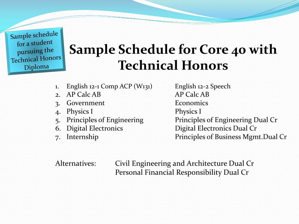 Sample schedule for a student pursuing the Technical Honors Diploma Sample Schedule for Core 40 with Technical Honors English 12-1 Comp ACP (W131) English 12-2 Speech AP Calc AB AP Calc AB Government Economics Physics I Physics I Principles of Engineering Principles of Engineering Dual Cr Digital Electronics Digital Electronics Dual Cr Internship Principles of Business Mgmt.Dual Cr Alternatives: Civil Engineering and Architecture Dual Cr Personal Financial Responsibility Dual Cr