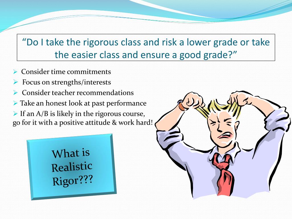 “Do I take the rigorous class and risk a lower grade or take the easier class and ensure a good grade?” Consider time commitments Focus on strengths/interests Consider teacher recommendations Take an honest look at past performance If an A/B is likely in the rigorous course, go for it with a positive attitude & work hard! What is Realistic Rigor???