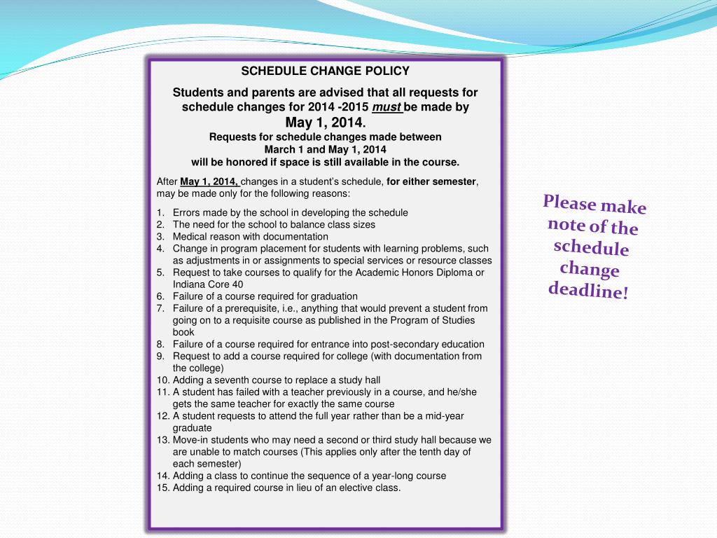 SCHEDULE CHANGE POLICY • Students and parents are advised that all requests for schedule changes for 2014 -2015 mustbe made by • May 1, 2014. • Requests for schedule changes made between • March 1 and May 1, 2014 • will be honored if space is still available in the course. • After May 1, 2014, changes in a student’s schedule, for either semester, may be made only for the following reasons: • 1. Errors made by the school in developing the schedule • 2. The need for the school to balance class sizes • 3. Medical reason with documentation • 4. Change in program placement for students with learning problems, such • as adjustments in or assignments to special services or resource classes • 5. Request to take courses to qualify for the Academic Honors Diploma or • Indiana Core 40 • 6. Failure of a course required for graduation • 7. Failure of a prerequisite, i.e., anything that would prevent a student from • going on to a requisite course as published in the Program of Studies • book • 8. Failure of a course required for entrance into post-secondary education • 9. Request to add a course required for college (with documentation from • the college) • 10. Adding a seventh course to replace a study hall • 11. A student has failed with a teacher previously in a course, and he/she • gets the same teacher for exactly the same course • 12. A student requests to attend the full year rather than be a mid-year • graduate • 13. Move-in students who may need a second or third study hall because we • are unable to match courses (This applies only after the tenth day of • each semester) • 14. Adding a class to continue the sequence of a year-long course • 15. Adding a required course in lieu of an elective class. Please make note of the schedule change deadline!