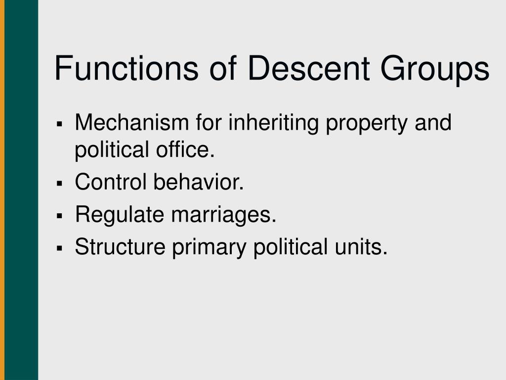 Functions of Descent Groups • Mechanism for inheriting property and political office. • Control behavior. • Regulate marriages. • Structure primary political units.
