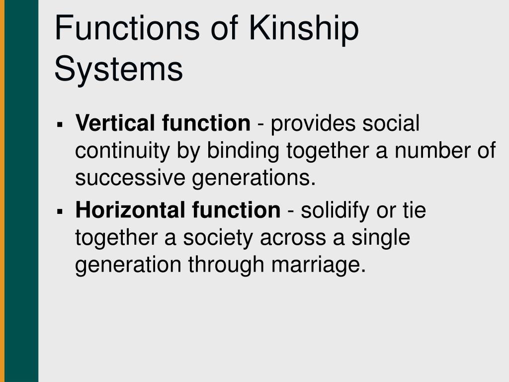 Functions of Kinship Systems • Vertical function - provides social continuity by binding together a number of successive generations. • Horizontal function - solidify or tie together a society across a single generation through marriage.