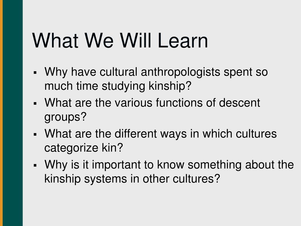 What We Will Learn • Why have cultural anthropologists spent so much time studying kinship? • What are the various functions of descent groups? • What are the different ways in which cultures categorize kin? • Why is it important to know something about the kinship systems in other cultures?