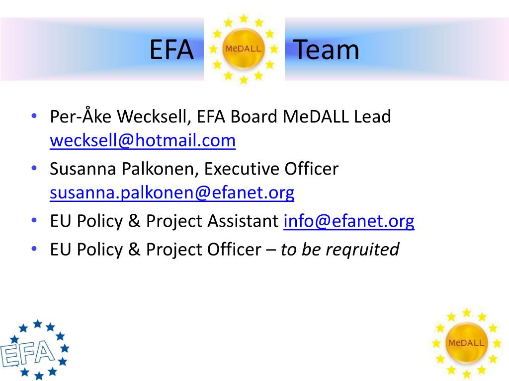 EFA Team • Per-Åke Wecksell, EFA BoardMeDALLLeadwecksell@hotmail.com • Susanna Palkonen, ExecutiveOfficersusanna.palkonen@efanet.org • EU Policy & Project Assistant info@efanet.org • EU Policy & Project Officer– to bereqruited
