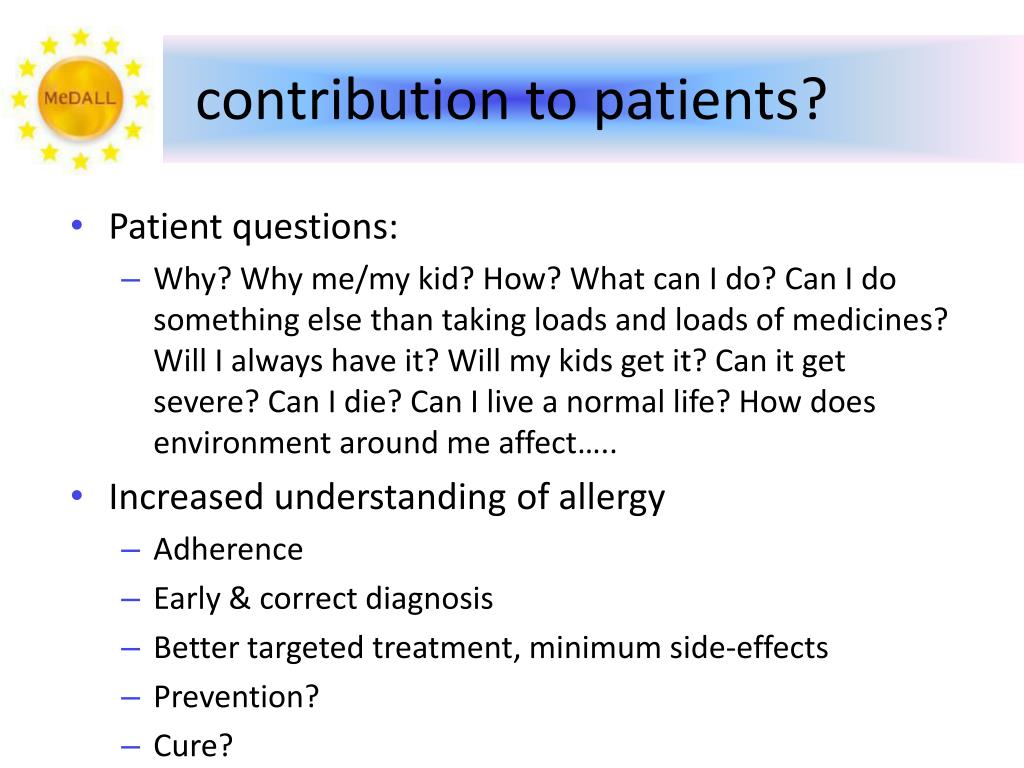 contribution to patients? • Patient questions: • Why? Why me/my kid? How? Whatcan I do? Can I do somethingelsethantakingloads and loads of medicines? Will I always have it? Will my kids getit? Can itgetsevere? Can I die? Can I live a normal life? How doesenvironmentaround me affect….. • Increasedunderstanding of allergy • Adherence • Early & correct diagnosis • Better targeted treatment, minimum side-effects • Prevention? • Cure?
