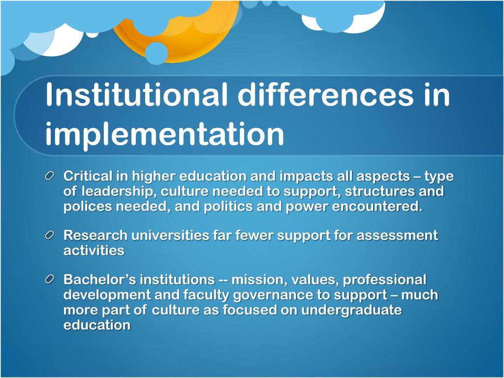 Institutional differences in implementation • Critical in higher education and impacts all aspects – type of leadership, culture needed to support, structures and polices needed, and politics and power encountered. • Research universities far fewer support for assessment activities • Bachelor’s institutions -- mission, values, professional development and faculty governance to support – much more part of culture as focused on undergraduate education