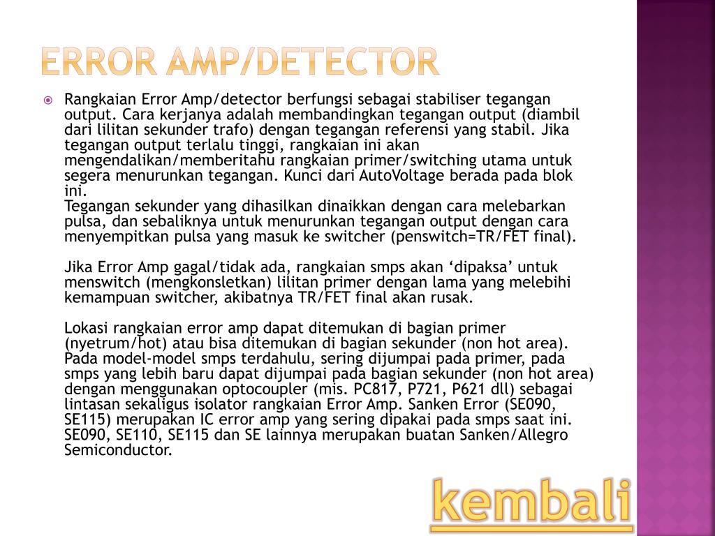 Error Amp/Detector • Rangkaian Error Amp/detector berfungsisebagaistabilisertegangan output. Cara kerjanyaadalahmembandingkantegangan output (diambildarililitansekundertrafo) denganteganganreferensi yang stabil. Jikategangan output terlalutinggi, rangkaianiniakanmengendalikan/memberitahurangkaian primer/switching utamauntuksegeramenurunkantegangan. KuncidariAutoVoltageberadapadablokini.Tegangansekunder yang dihasilkandinaikkandengancaramelebarkanpulsa, dansebaliknyauntukmenurunkantegangan output dengancaramenyempitkanpulsa yang masukke switcher (penswitch=TR/FET final).Jika Error Amp gagal/tidakada, rangkaiansmpsakan ‘dipaksa’ untukmenswitch (mengkonsletkan) lilitan primer dengan lama yang melebihikemampuan switcher, akibatnya TR/FET final akanrusak.Lokasirangkaian error amp dapatditemukandibagian primer (nyetrum/hot) ataubisaditemukandibagiansekunder (non hot area). Pada model-model smpsterdahulu, seringdijumpaipada primer, padasmps yang lebihbarudapatdijumpaipadabagiansekunder (non hot area) denganmenggunakanoptocoupler (mis. PC817, P721, P621 dll) sebagailintasansekaligus isolator rangkaian Error Amp. Sanken Error (SE090, SE115) merupakan IC error amp yang seringdipakaipadasmpssaatini. SE090, SE110, SE115 dan SE lainnyamerupakanbuatan Sanken/Allegro Semiconductor. kembali
