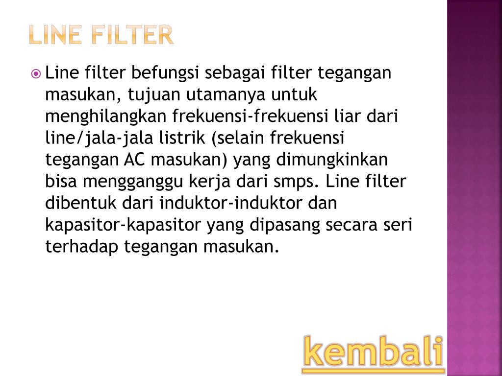 Line Filter • Line filter befungsi sebagai filter tegangan masukan, tujuan utamanya untuk menghilangkan frekuensi-frekuensi liar dari line/jala-jala listrik (selain frekuensi tegangan AC masukan) yang dimungkinkan bisa mengganggu kerja dari smps. Line filter dibentuk dari induktor-induktor dan kapasitor-kapasitor yang dipasang secara seri terhadap tegangan masukan. kembali