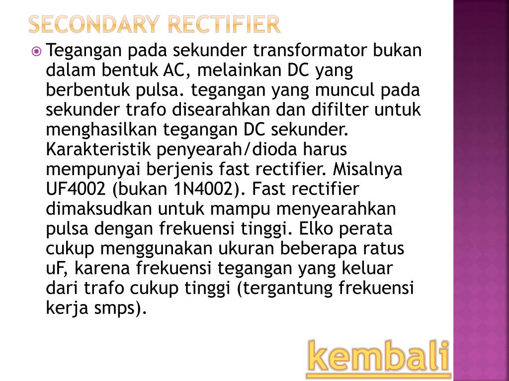 Secondary Rectifier • Teganganpadasekundertransformatorbukandalambentuk AC, melainkan DC yang berbentukpulsa. tegangan yang munculpadasekundertrafodisearahkandandifilteruntukmenghasilkantegangan DC sekunder. Karakteristikpenyearah/diodaharusmempunyaiberjenis fast rectifier. Misalnya UF4002 (bukan 1N4002). Fast rectifier dimaksudkanuntukmampumenyearahkanpulsadenganfrekuensitinggi. Elko peratacukupmenggunakanukuranbeberaparatusuF, karenafrekuensitegangan yang keluardaritrafocukuptinggi (tergantungfrekuensikerjasmps). kembali