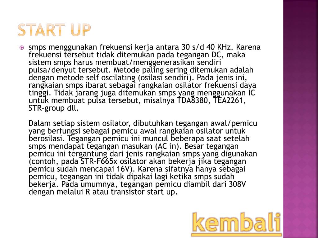 Start Up • smpsmenggunakanfrekuensikerjaantara 30 s/d 40 KHz. Karenafrekuensitersebuttidakditemukanpadategangan DC, makasistemsmpsharusmembuat/menggenerasikansendiripulsa/denyuttersebut. Metode paling seringditemukanadalahdenganmetode self oscilating (osilasisendiri). Padajenisini, rangkaiansmpsibaratsebagairangkaianosilatorfrekuensidayatinggi. Tidakjarangjugaditemukansmps yang menggunakan IC untukmembuatpulsatersebut, misalnya TDA8380, TEA2261, STR-group dll.Dalamsetiapsistemosilator, dibutuhkanteganganawal/pemicu yang berfungsisebagaipemicuawalrangkaianosilatoruntukberosilasi. Teganganpemicuinimunculbeberapasaatsetelahsmpsmendapatteganganmasukan (AC in). Besarteganganpemicuinitergantungdarijenisrangkaiansmps yang digunakan (contoh, pada STR-F665x osilatorakanbekerjajikateganganpemicusudahmencapai 16V). Karenasifatnyahanyasebagaipemicu, teganganinitidakdipakailagiketikasmpssudahbekerja. Padaumumnya, teganganpemicudiambildari 308V denganmelalui R atau transistor start up. kembali