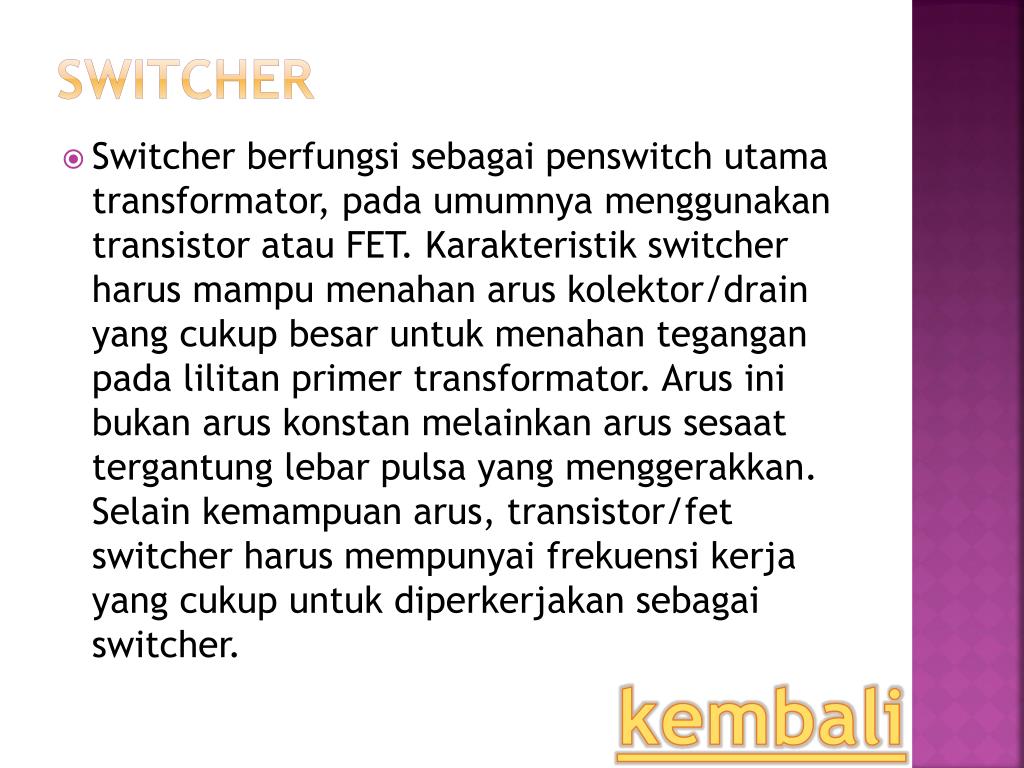 Switcher • Switcher berfungsi sebagai penswitch utama transformator, pada umumnya menggunakan transistor atau FET. Karakteristik switcher harus mampu menahan arus kolektor/drain yang cukup besar untuk menahan tegangan pada lilitan primer transformator. Arus ini bukan arus konstan melainkan arus sesaat tergantung lebar pulsa yang menggerakkan. Selain kemampuan arus, transistor/fet switcher harus mempunyai frekuensi kerja yang cukup untuk diperkerjakan sebagai switcher. kembali