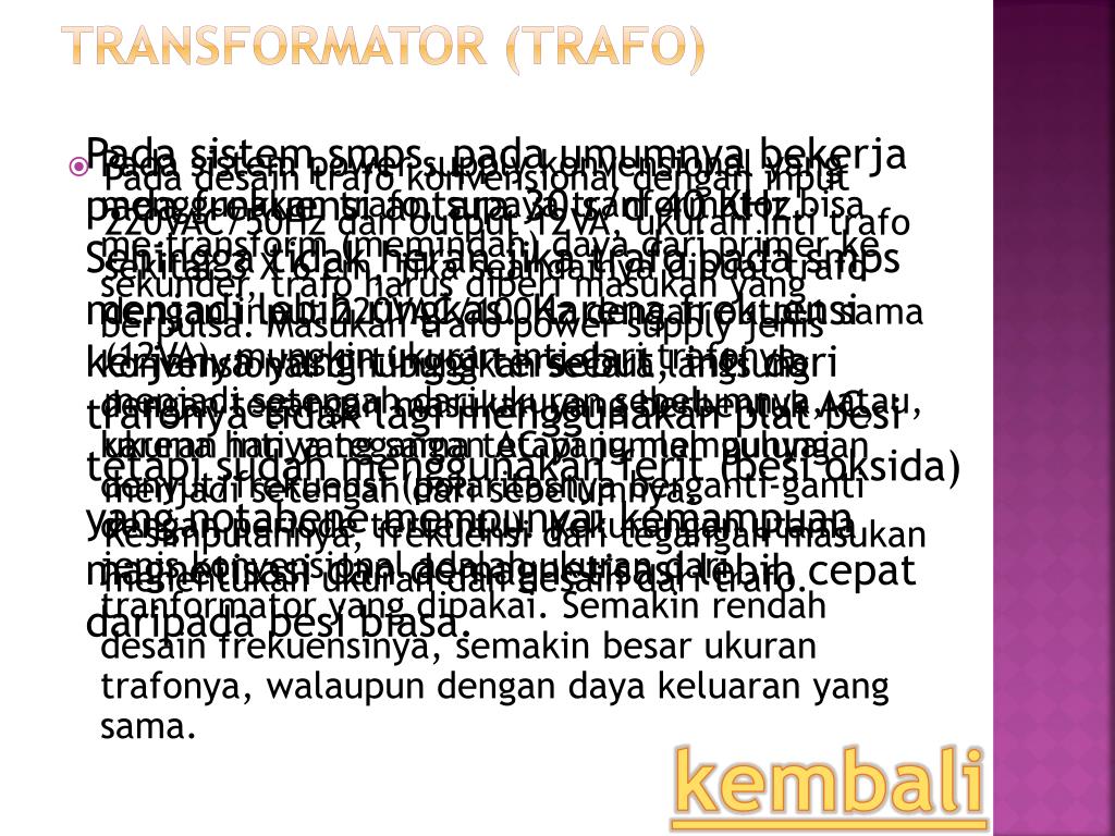 Transformator (trafo) Pada sistem smps, pada umumnya bekerja pada frekuensi antara 30 s/d 40 KHz. Sehingga tidak heran jika trafo pada smps menjadi lebih ringkas. Karena frekuensi kerjanya yang tinggi tersebut, inti dari trafonya tidak lagi menggunakan plat besi tetapi sudah menggunakan ferit (besi oksida) yang notabene mempunyai kemampuan magnetisasi dan demagnetisasi lebih cepat daripada besi biasa. Pada desain trafo konvensional dengan input 220VAC/50Hz dan output 12VA, ukuran inti trafo sekitar 3 X 6 cm, jika seandainya dibuat trafo dengan input 220VAC/100Hz dengan output sama (12VA), mungkin ukuran inti dari trafonya menjadi setengah dari ukuran sebelumnya, atau, ukuran inti yang sama tetapi jumlah gulungan menjadi setengah dari sebelumnya. Kesimpulannya, frekuensi dari tegangan masukan menentukan ukuran dan desain dari trafo. • Padasistem power supply konvensional yang menggunakantrafo, supayatranformatorbisa me-transform (memindah) dayadari primer kesekunder, trafoharusdiberimasukan yang berpulsa. Masukantrafo power supply jeniskonvensionaldihubungkansecaralangsungdenganteganganmasukan yang berbentuk AC, karenahanyategangan AC yang mempunyaidenyut/frekuensi (polaritasnyaberganti-gantidenganperiodetertentu). Kekuranganutamajeniskonvensionaladalahukurandaritranformator yang dipakai. Semakinrendahdesainfrekuensinya, semakinbesarukurantrafonya, walaupundengandayakeluaran yang sama. kembali