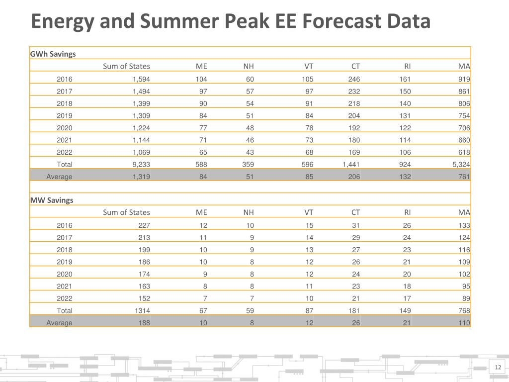 Regional EE Forecast Results(2016 to 2022) • Total projected spending on energy efficiency: $5.6 billion • Peak demand rises more slowly than with traditional forecast • Average annual reduction in peak demand: 188 MW • Total projected reduction over seven years: 1,314 MW • In VT, forecasted peak demand declines • Annual electricity consumption remains flat compared to traditional forecast • Average annual energy savings: 1,319 GWh • Total projected reduction over seven years: 9,233 GWh • RI and VT forecasts show declining annual electricity consumption